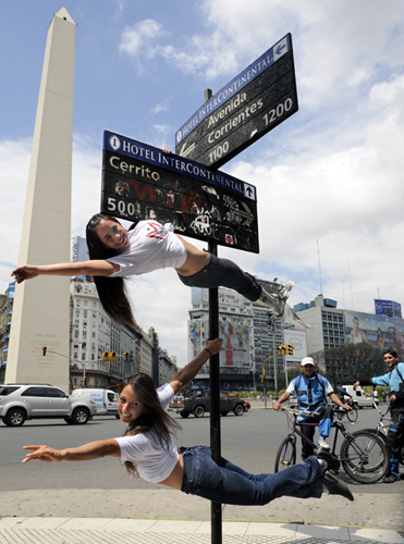 10月19日,阿根廷布宜诺斯艾利斯市街头,钢管舞小姐在街头表演,路边的路灯、电线杆变身为钢管舞道具。图片来源:中国新闻网