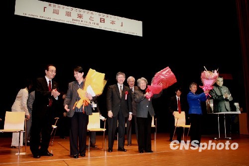 10月28日下午,《周恩来与日本》的图片展和研讨会在日本早稻田大学小野梓纪念馆举行。图为周恩来邓颖超研究中心主任廖心文、曾担任周恩来日文翻译的王效贤、曾担任周恩来邓颖超秘书的赵炜接受日本主办方献花。中新社发 关妍 摄