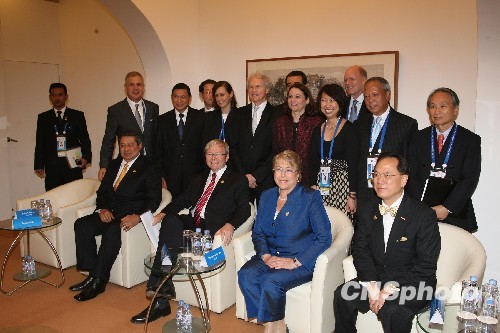 十一月十四日下午,亚太经合组织各经济体成员领导人分组与APEC工商咨询理事会代表,在新加坡总统府举行对话会。图为中国香港特区行政长官曾荫权、智利总统巴切莱特、澳大利亚总理陆克文、印度尼西亚总统苏西洛(从右至左)与部分工商咨询理事会代表对话会前合影。中新社发 郑祚声 摄