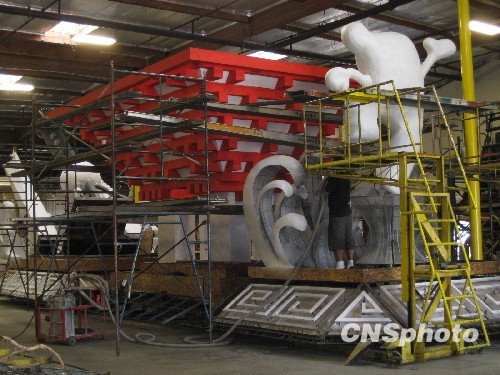 参加2010年元旦美国帕萨迪娜玫瑰花车大游行的“上海世博花车”在美国初具雏型,如今花车底座、支架都已完工,花车已大致成型,目前正在洛杉矶进行花车装饰。“上海世博花车”的主题为“城市,让生活更美好”,花车主体以上海世博的中国馆为主,后方凸显上海城市的地标:东方明珠、金茂大厦等,上海黄浦江的浪花则作为花车的铺垫。另外,上海世博吉祥物“海宝”则将在最前方引领花车并向游客招手。中新社发 卢威 摄
