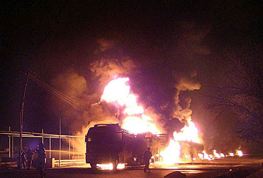 11月21日,在阿富汗北部昆都士省的路上,阿富汗消防员向一辆燃烧的油罐车喷水灭火。三辆向美军和北约盟国军队供油的油罐车遭到火箭弹袭击,燃烧起火。