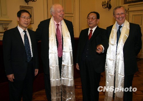当地时间12月3日,法国参议院副议长、马赛市长戈丹在马赛会见了到访的中国西藏自治区人大代表团。戈丹表示,将推动法国参议员访问西藏。图为西藏自治区人大代表团团长、西藏自治区人大常委会主任列确与戈丹、中国驻马赛总领事宋炳林等在马赛市政府。中新社发 吴卫中 摄