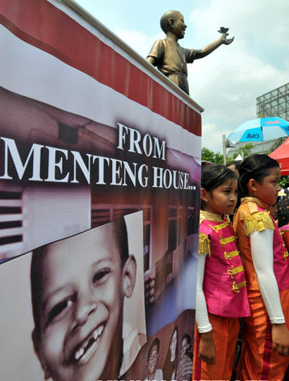 12月10日,印尼小学生们在雅加达塔曼门登公园与新落成的美国总统奥巴马10岁时形象制作的铜像合影。奥巴马1967年至1971年曾在塔曼门登公园附近居住。