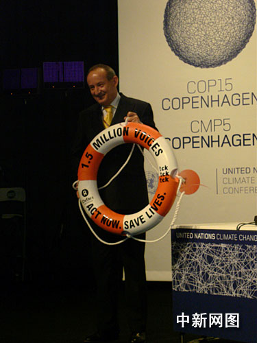 哥本哈根联合国气候变化大会15日继续进行。联合国负责气候变化最高官员、《联合国气候变化框架公约》执行秘书德波尔当天获赠象征气候变暖的救生圈。 中新网发 李洋 摄