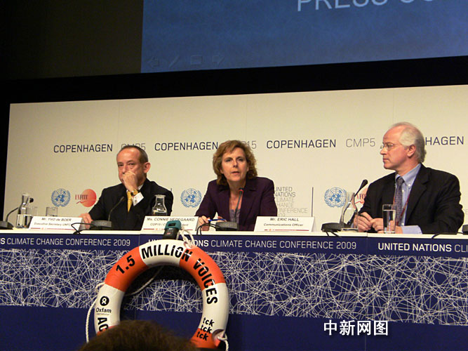 哥本哈根联合国气候变化大会主席康妮·赫泽高(中)当地时间15日举行记者会,介绍会议进展并回答记者提问。左为联合国负责气候变化谈判的高级官员、《联合国气候变化框架公约》秘书处执行秘书德波尔。 中新网发 李洋 摄