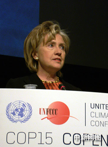 美国国务卿希拉里12月17日在哥本哈根联合国气候峰会期间与媒体记者见面,并阐述了美方在应对气候变化问题上的立场。李洋 摄