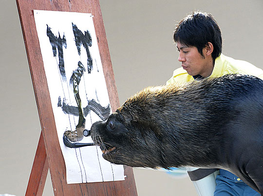 12月30日,日本神奈川八景岛海洋乐园水族馆内,海狮表演了用毛笔在纸上“写”汉字的节目。