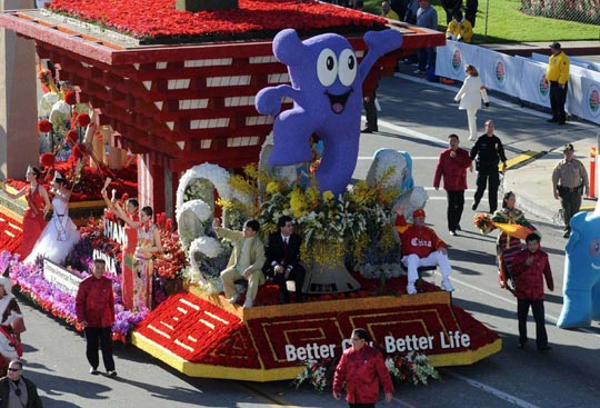 美国当地1月1日,第一百二十一届美国玫瑰花车大游行在加州帕萨迪纳市隆重举行。著名影星成龙助阵中国上海世博花车。