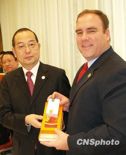 当地时间2010年元旦,美国加州众议员科特·海格曼在洛杉矶会见上海世博花车代表团团长、上海市长代表杨振武,对上海世博花车成功参加第121届美国帕萨迪纳玫瑰花车大游行表示赞誉。杨振武团长向科特‧海格曼赠送上海世博徽章和领带,并欢迎他参观上海世博会。中新社发 卢威 摄
