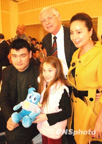 当地时间2010年1月2日,NBA篮球明星、上海世博会形象大使姚明在美国洛杉矶向洛杉矶县政委员安东诺维奇赠送上海世博吉祥物-海宝,安东诺维奇一家高兴地与姚明拍“合家欢”,并约定2010年5月上海见。 中新社发 卢威 摄