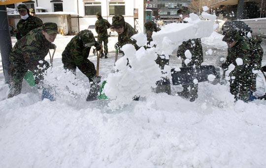 四日,韩国大部分地区遭遇大雪。至下午二时左右,首尔地区积雪厚度超过二十八厘米,这是韩国自一九三七年开始进行积雪量观测以来的最新纪录。图为1月5日,韩国士兵在街头除雪。