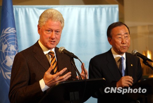 联合国秘书长潘基文当地时间1月21日与联合国海地特使、美国前总统克林顿举行会晤后共同会见记者。中新社发 孙宇挺 摄