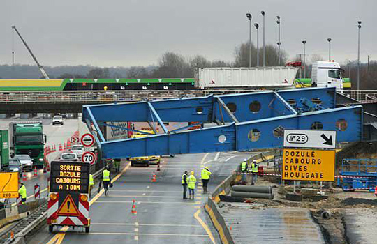 2月2日,法国诺曼底多聚莱附近高速公路上的一座倒塌桥梁,这座重达260吨的桥梁倒塌造成了3名工人受伤。
