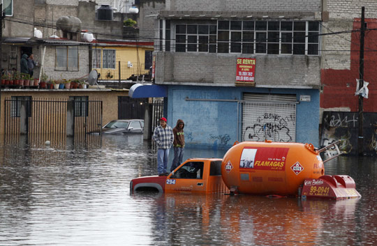 近日,墨西哥中部地区遭遇暴雨引发洪水,给当地的道路交通造成严重影响。图为2月4日,人们穿行在被洪水淹没的街道。