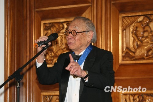 当地时间2月11日晚,93岁的美籍华人建筑设计大师贝聿铭,在伦敦获颁英国皇家建筑师协会金奖。这是其自1983年荣获建筑界奥斯卡奖——普利兹克奖之后,获得的又一项世界顶级建筑设计大奖。图为他在颁奖典礼上发表获奖感言。中新社发 魏群 摄