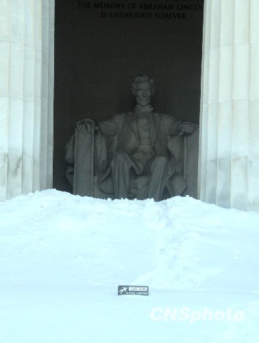 连续两日的暴风雪终于于2月11日停歇,这场雪的降雪量创下了华盛顿历史上的百年纪录。图为11日厚厚的积雪已覆盖 高高高的台阶,堆到林肯纪念堂的门口。中新社发 吴庆才 摄