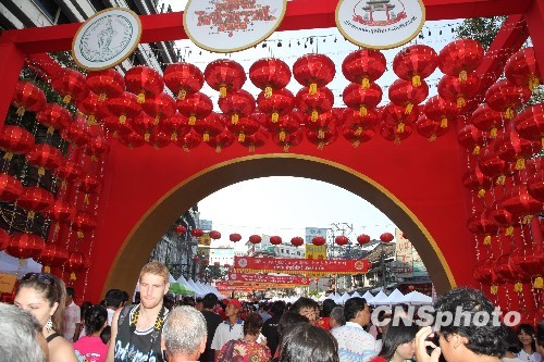 农历大年初一下午的曼谷唐人街耀华力路,灯笼高挂,锣鼓喧天,人声鼎沸,数十万人磨肩接踵地拥挤在长达2公里长的曼谷唐人街耀华力路两旁,翘头等待诗琳通公主驾临并主持2010欢乐春节文化活动开幕式。图为热闹非凡的耀华力路。中新社发 顾时宏 摄