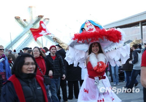 加拿大原住民香农在冬奥火炬前载歌载舞,以表达对加拿大举办冬奥会的高兴和自豪。香农来自不列颠哥伦比亚省塔尔坦印第安部落。中新社发 赖海隆 摄