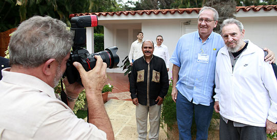 2月24日,巴西总统卢拉在哈瓦那与古巴前领导人菲德尔·卡斯特罗进行了私人会面。在会面中卢拉客串摄影师,为卡斯特罗(右)和巴西通信部长富兰克林马丁斯(蓝色上衣)拍摄合影。