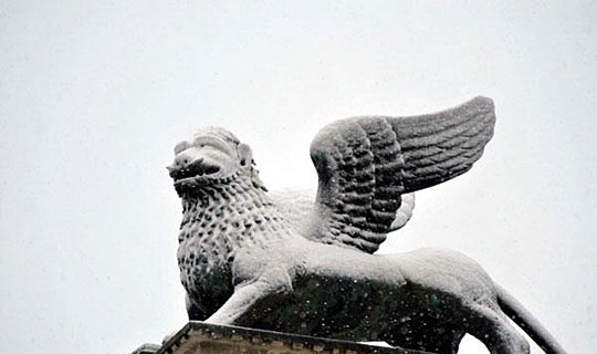 3月10日,在意大利威尼斯,一座狮子雕塑被雪覆盖。意大利中北部地区近日再次遭受风雪袭击。