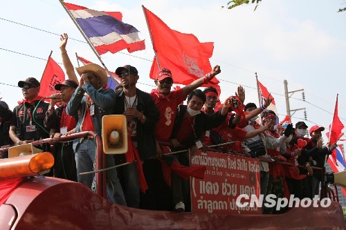 3月15日,泰国“红衫军”数万人驾车浩浩荡荡前往曼谷第11步兵营进行示威活动。11步兵营位于曼谷北部,距离“红衫军”在繁华桥中心聚集点约20公里,是“红衫军”举行示威活动后泰国政府设立的局势监控指挥中心据点,泰国总理阿披实、陆军总司令阿努蓬等军政要员都暂住在该营地。中新社发 顾时宏 摄
