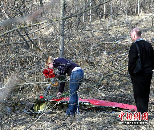 4月11日,波兰总统卡钦斯基专机坠毁地点道路开通,但是警戒线核心区仍然关闭。一名住在俄罗斯的波兰女孩从电视中得知噩耗后,赶到事故现场献花祭奠。中新社发 田冰 摄