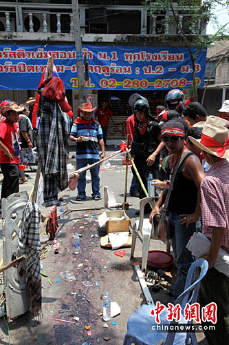 4月10日晚,泰国首都曼谷,“红衫军”与军警发生激烈冲突,造成重大人员伤亡。图为冲突现场留下的清晰可辨的血迹。中新社发 顾时宏 摄
