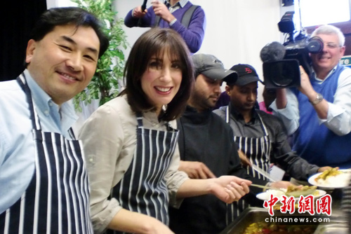 当地时间13日,英国保守党党首卡梅伦的妻子萨曼莎,现身伦敦北部的孟加拉慈善社区“索马中心”,与社区的妇女儿童以及老人共进午餐。英国大选选战正酣,现任首相布朗及主要对手保守党领袖卡梅伦,两日来在“主战场”相继公布竞选纲领,而他们的“另一半”也没闲着,各自“出招”为老公拉票助选。图为萨曼莎(左二)与华人国会议员参选人李泽文(左一)在为社区居民盛饭菜。中新社发 魏群 摄