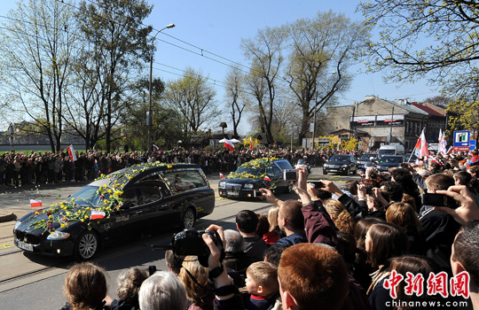 当地时间4月18日,卡钦斯基夫妇的葬礼在波兰南部城市克拉科夫举行。波兰总统卡钦斯基及其夫人乘坐的专机10日在俄罗斯斯摩棱斯克失事,机上人员全部遇难。图片来源:中国新闻网