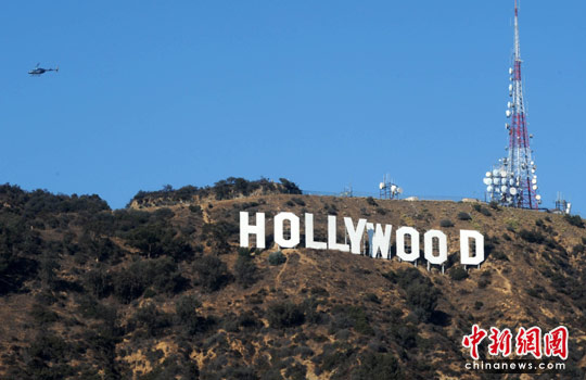 洛杉矶市政府官员4月26日正式宣布,政府已筹措到1250万美元资金,可以买下周边土地的所有权,当地著名地标——好莱坞(Hollywood)标志景观得以保留。 拥有该土地的开发商原计划在这里建设山顶豪宅出售,当地政府和民众反对在著名地标傍大兴土木、破坏景观。政府买下这块土地后,这里将成为公园的一部分。图为著名地标“好莱坞”标志。 中新社发 张炜 摄