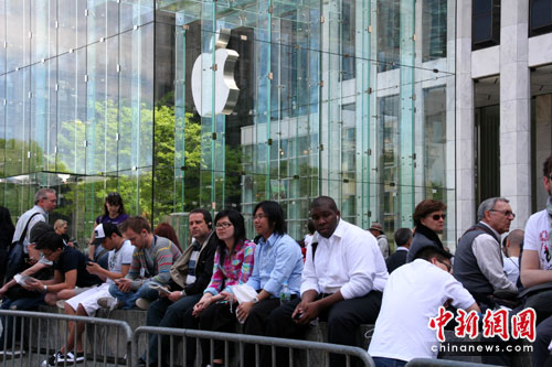 苹果公司旗下最新电子产品3G版Ipad,于美国东部时间周五(4月30日)下午5点正式在美国各苹果门店发售。图为纽约曼哈顿五大道苹果总店门前,中午时分已有许多苹果产品的簇拥者不辞辛苦排起长队,等待购买。中新社发 魏晞 摄