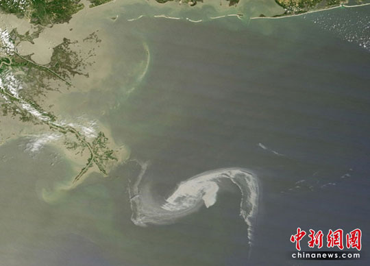 4月30日,在美国路易斯安那州海岸,为阻隔原油扩散而设的护栏带被海风浪冲到岸边。当天,美国总统奥巴马下令调查墨西哥湾石油钻井平台爆炸事件,以避免将来类似事件再次发生。平台爆炸沉没后泄漏的原油当天已漂至美国沿岸。
