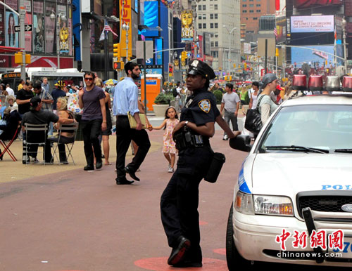 5月2日,纽约时报广场依旧人流如织,丝毫不受1日晚间那一没被引爆的汽车炸弹事件影响。但2日时报广场警力增多,图为女警在广场巡视。1日晚间,一辆停于时报广场的日产车冒烟并发出轻微爆破声,附近的小贩报警后,纽约警察从车内清理出大量爆炸物,幸而没引发更大的灾难,纽约市长彭博称“躲过一劫”。 新社发 孙宇挺 摄