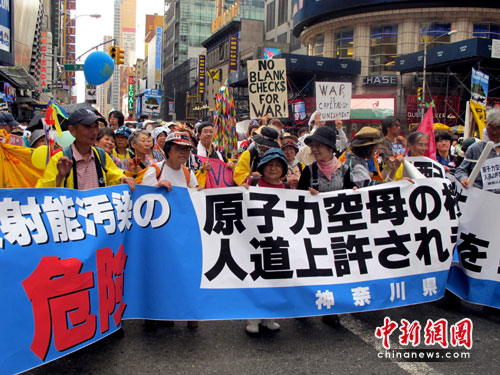 5月2日,在纽约时报广场附近的42街与第7大道举行了一场声势浩大的反战游行,游行以日本人为主,手举标语高喊口号反对战争与核武器,呼吁和平。诸多警察也参与维护秩序,游行队伍浩浩荡荡,游行没有受到昨晚广场“汽车哑弹”事件影响。5月1日晚间,一辆停于时报广场的日产车冒烟并发出轻微爆破声,附近的小贩报警后,纽约警察从车内清理出大量爆炸物,幸而没引发更大的灾难,纽约市长彭博称“躲过一劫”。中新社发 孙宇挺 摄