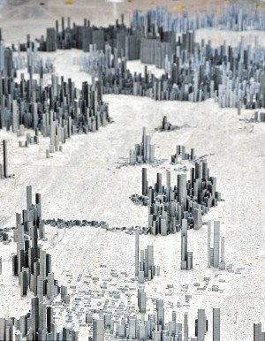 在这座订书针构成的微型城市中,银光闪闪的摩天大楼鳞次栉比,耸入城市天际。彼得说,他趴在地板上整整40个小时,只为在10英尺的建筑基座上再搭至20英尺。彼得将这些建筑模型分为不同的尺寸,其中既有5英寸高的“摩天大厦”,也有仅仅一根订书针做成的“小矮屋”。彼得能完成这件作品,靠的是他双手过人的稳定性:“最大挑战就是如何保持所有的建筑稳立不倒。”当然,罗马也并非一天建成。彼得称:“有些时候,我花了数小时搭建的建筑却被地球引力毫不留情地瞬间瓦解。”(周勉)