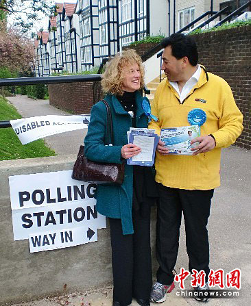 英国国会华裔议员候选人李泽文在大选日拉票——中新网