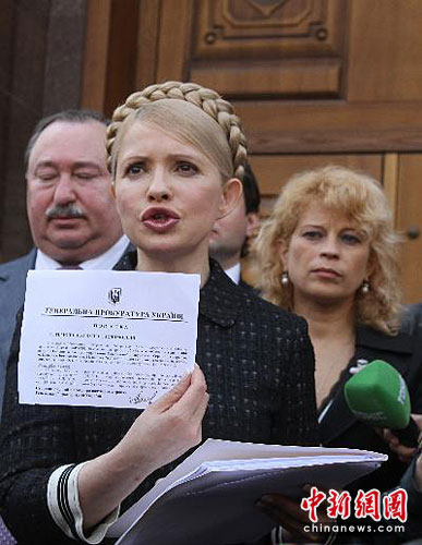 5月12日,乌克兰前总理季莫申科在位于首都基辅的乌总检察院门前对记者展示传票。乌总检察院传唤季莫申科于当地时间12日上午10时前往总检察院调查局接受刑事案件调查。