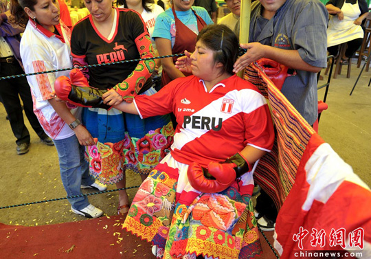 5月13日,秘鲁利马高地举办的传统食品博览会上,两名安第斯农民妇女穿着象征秘鲁和玻利维亚的裙子同台搏击妙趣横生。图片来源:中国新闻网