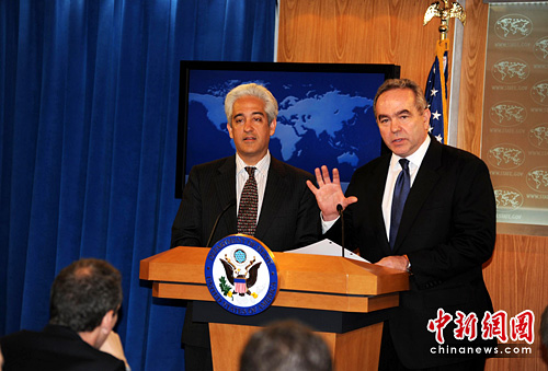 美国国务院19日就希拉里即将于21日开始的亚洲之行举行吹风会。美国负责亚太事务的助理国务卿坎贝尔表示,希拉里将于5月21日到26日访问日本、中国、韩国,但此行的“中心日程”是对中国的访问,包括参观上海世博会和出席在北京举行的第二轮美中战略与经济对话。图为坎贝尔(右)与美国财政部执行秘书和中国事务高级顾问洛文杰(左)在当天的吹风会上回答记者提问。中新社发 吴庆才 摄