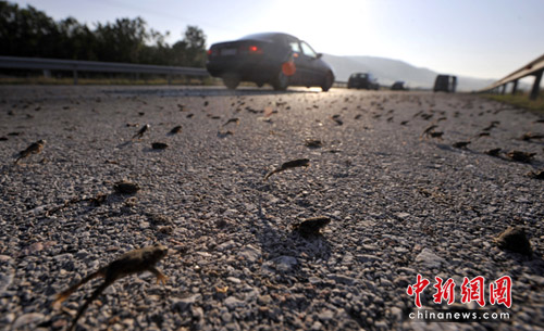 26日,希腊东北部地区的一条高速公路遭数百万只青蛙“占据”而被迫关闭了两个小时。希腊环保部门表示,这些青蛙可能只是在前往附近小湖找食物过程中“碰巧路过”高速公路。