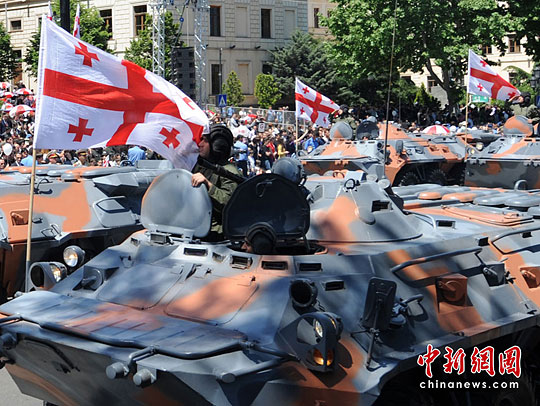 5月26日,在格鲁吉亚首都第比利斯,受阅部队从议会大厦前走过。当日,格鲁吉亚在第比利斯举行庆祝格独立日阅兵典礼,格总统萨卡什维利在议会大厦前检阅军队并发表演讲。