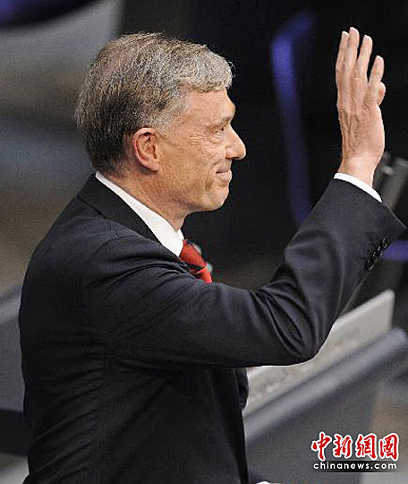 据外电报道,德国总统霍斯特·克勒2010年5月31日宣布辞去总统职务。这是2009年5月23日,在德国柏林,霍斯特·克勒在选举中获胜赢得连任后向妻子招手的资料照片。
