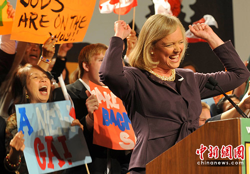 当地时间6月8日晚,美国加州州长选举党内初选揭晓,共和党参选人、电子湾(Ebay)前执行长梅格·惠特曼战胜对手史蒂夫。今年11月,她将与民主党候选人、前加州州长杰瑞·布朗竞选新一任州长。图为梅格·惠特曼在洛杉矶庆祝胜选。中新社发 张炜 摄