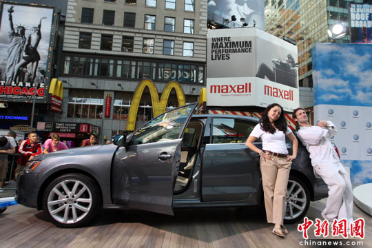 当地时间6月15日,德国大众在纽约时代广场人流如织的中心地带,大费周章地搭起巨大展台,并邀来歌手凯蒂·佩里及众多模特为其2011款捷达举行“世界首演”,高调宣传新车,以期在竞争激烈的美国汽车市场中,博得更多关注。中新社发 魏晞 摄