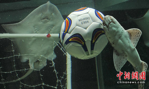 组图:龙虾、鲨鱼水族馆里踢足球