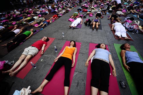 6月21日,数千瑜伽爱好者在美国纽约时报广场用集体瑜伽的方式迎接夏至的到来。
