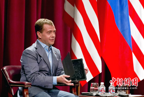 当地时间6月23日,正在美国访问的俄罗斯总统梅德韦杰夫走访推特、思科和苹果等数家硅谷高科技企业,并在斯坦福大学演讲时展示他的喜爱的苹果产品iPhone和iPad。图为梅德韦杰夫携带装有演讲稿的iPad。中新社发 陈钢 摄