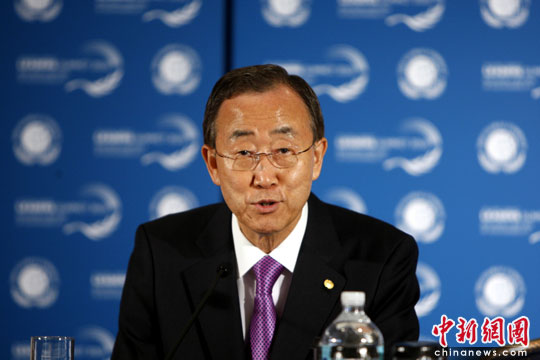第三届“全球契约”峰会24日在纽约开幕,在当日举行的记者会上,潘基文呼吁全球企业恪守企业社会责任,他表示这是每一个企业的底线。中新社发 孙宇挺 摄