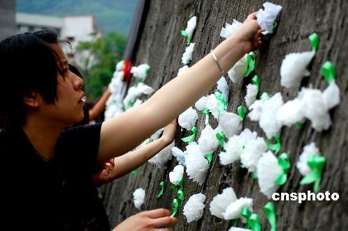 2009年5月12日,为了纪念汶川大地震一周年,重庆市西南大学设立了四川汶川特大地震遇难同胞祭奠墙。该校三千余名同学和数十名灾区大学生一起在祭奠墙上写下祝福语,献上了绿丝带和白菊花,缅怀遇难同胞,纪念汶川地震一周年。中新社发 许康平 摄
