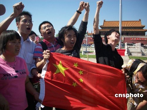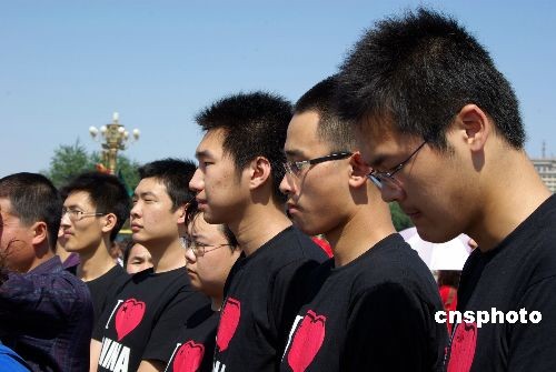 [汶川地震一周年]民众在天安门广场哀悼遇难同胞 为中国加油